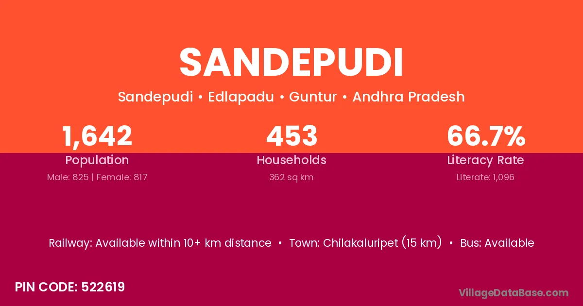 Sandepudi village has a total population of 1,642 people, of which 825 are males and 817 are females.
