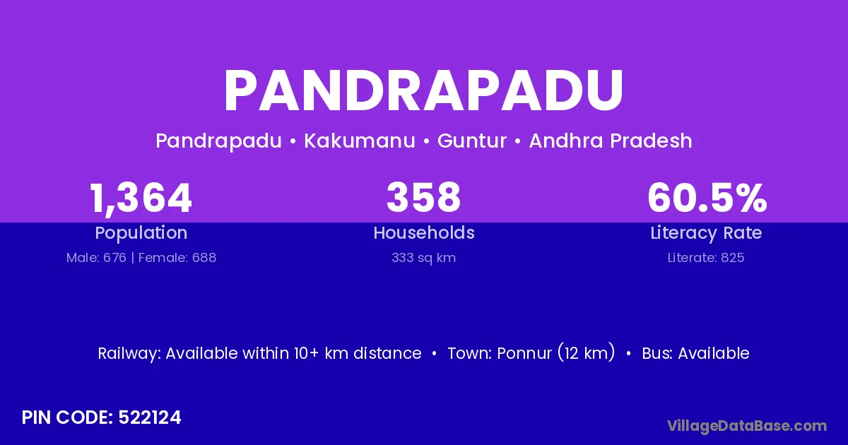 Ponnur (12 km) is the nearest town to Pandrapadu village for major economic activities and is located approximately 12 km away.