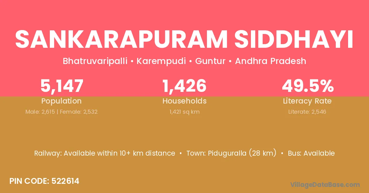 Piduguralla (28 km) is the nearest town to Sankarapuram Siddhayi village for major economic activities and is located approximately 28 km away.