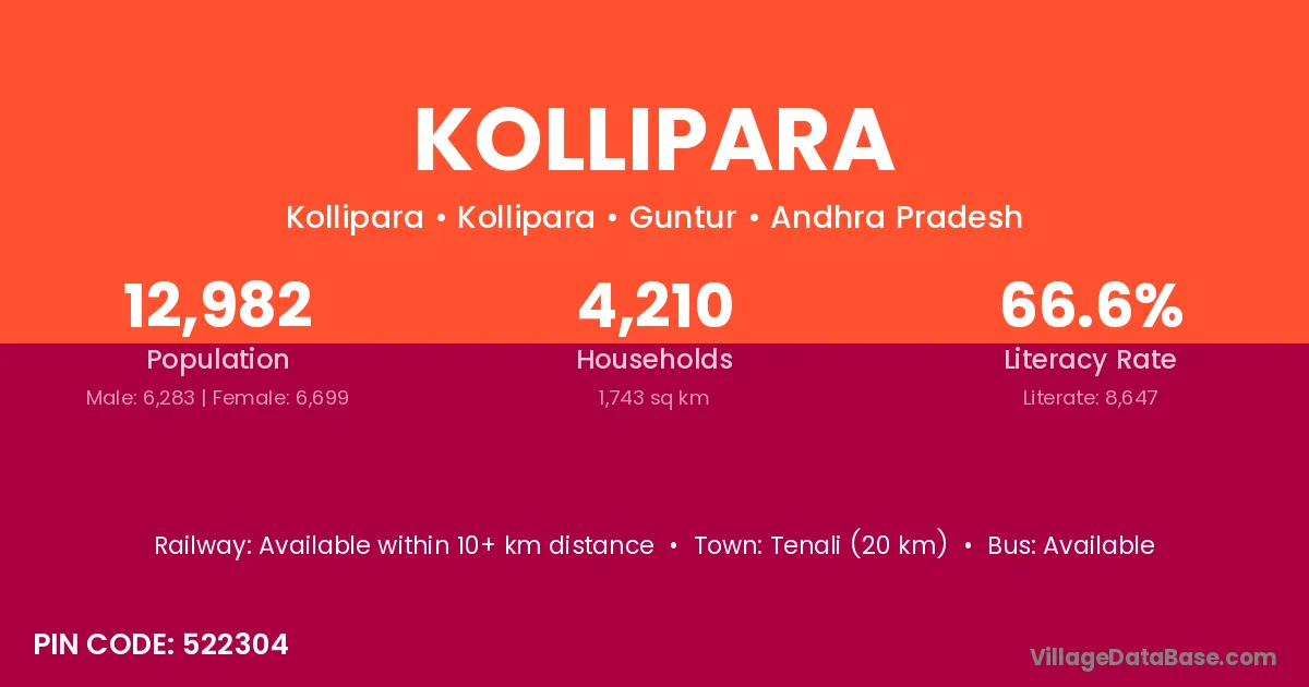 Kollipara village has a total population of 12,982 people, of which 6,283 are males and 6,699 are females.