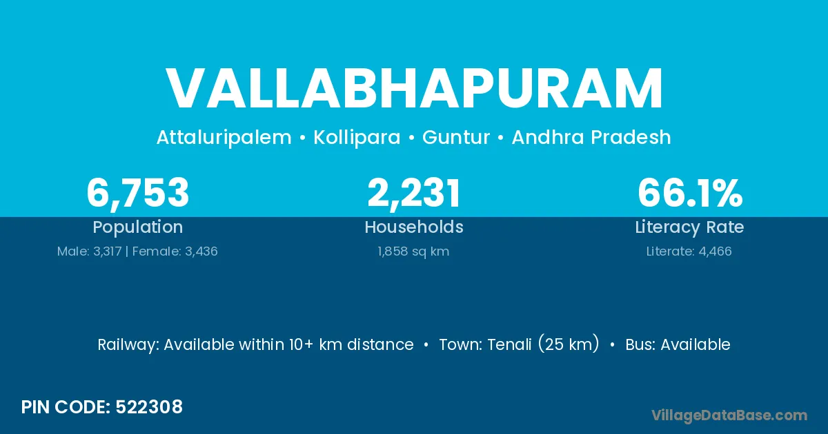Tenali (25 km) is the nearest town to Vallabhapuram village for major economic activities and is located approximately 25 km away.