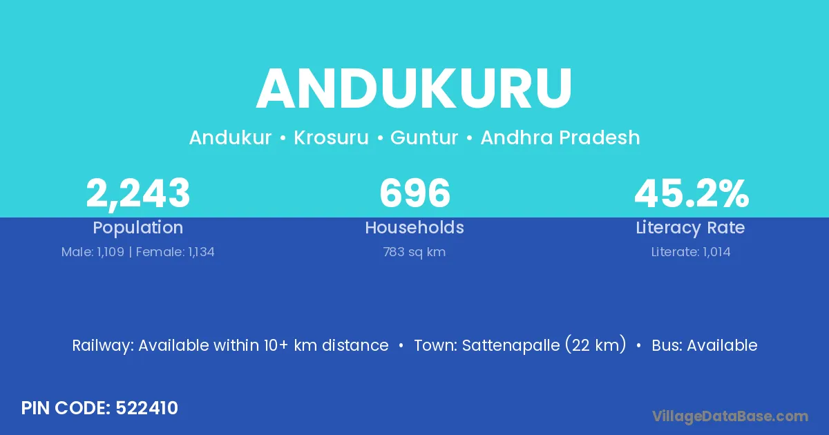 Sattenapalle (22 km) is the nearest town to Andukuru village for major economic activities and is located approximately 22 km away.