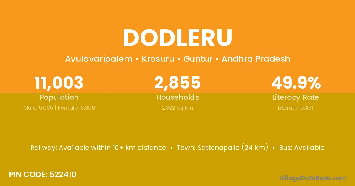 Sattenapalle (24 km) is the nearest town to Dodleru village for major economic activities and is located approximately 24 km away.