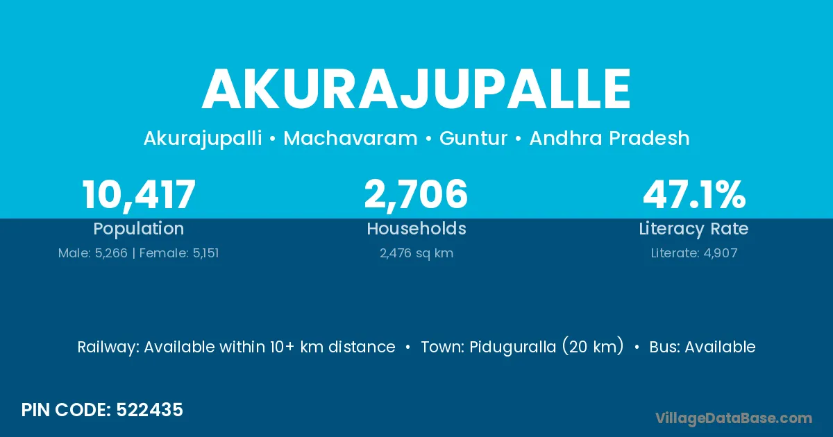 Akurajupalle village has a total population of 10,417 people, of which 5,266 are males and 5,151 are females.