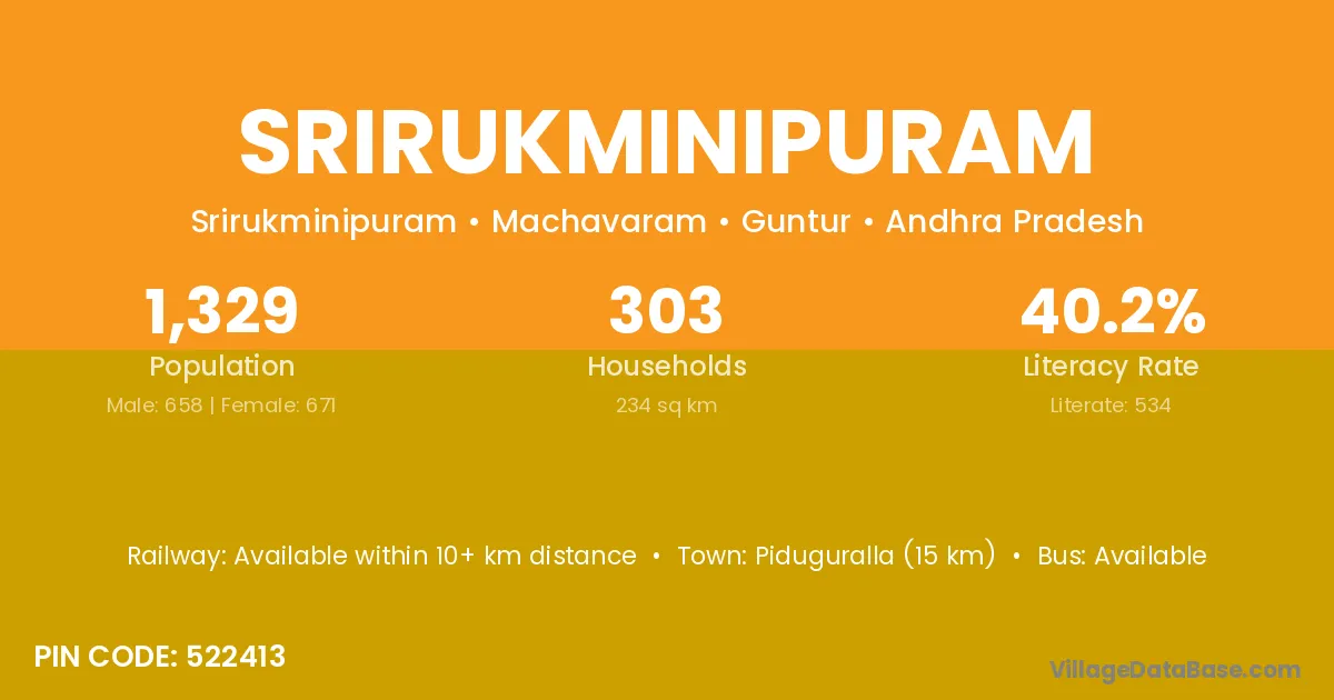 Srirukminipuram village has a total population of 1,329 people, of which 658 are males and 671 are females.