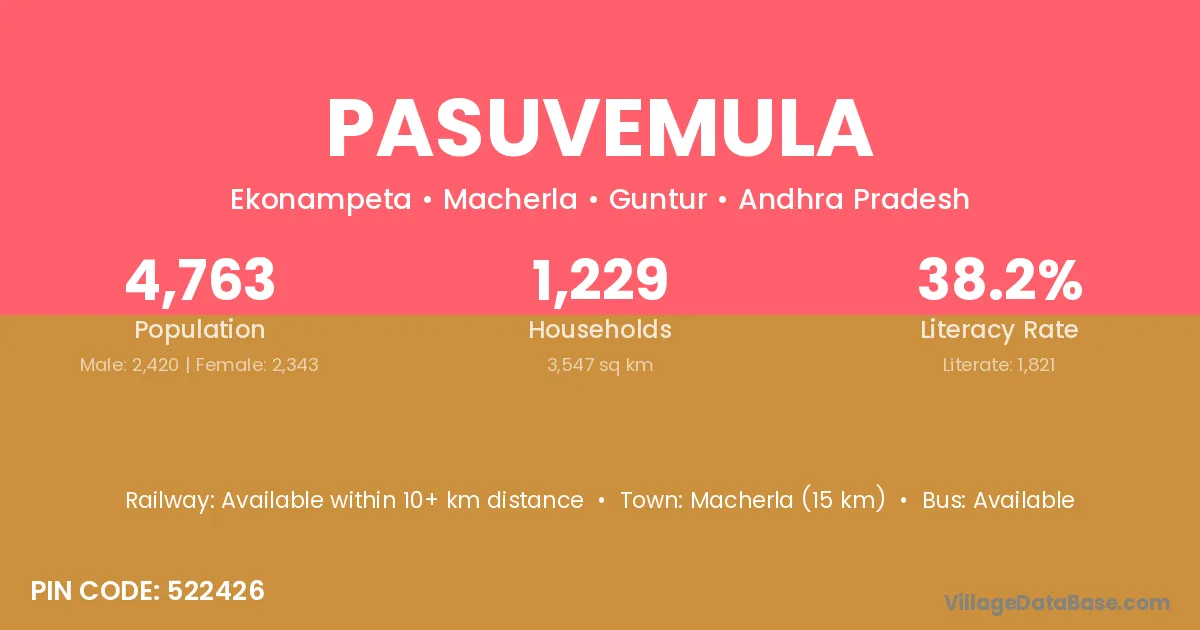 Pasuvemula village has a total population of 4,763 people, of which 2,420 are males and 2,343 are females.