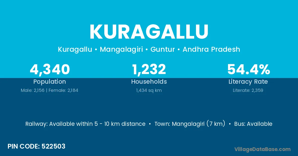 Mangalagiri (7 km) is the nearest town to Kuragallu village for major economic activities and is located approximately 7 km away.