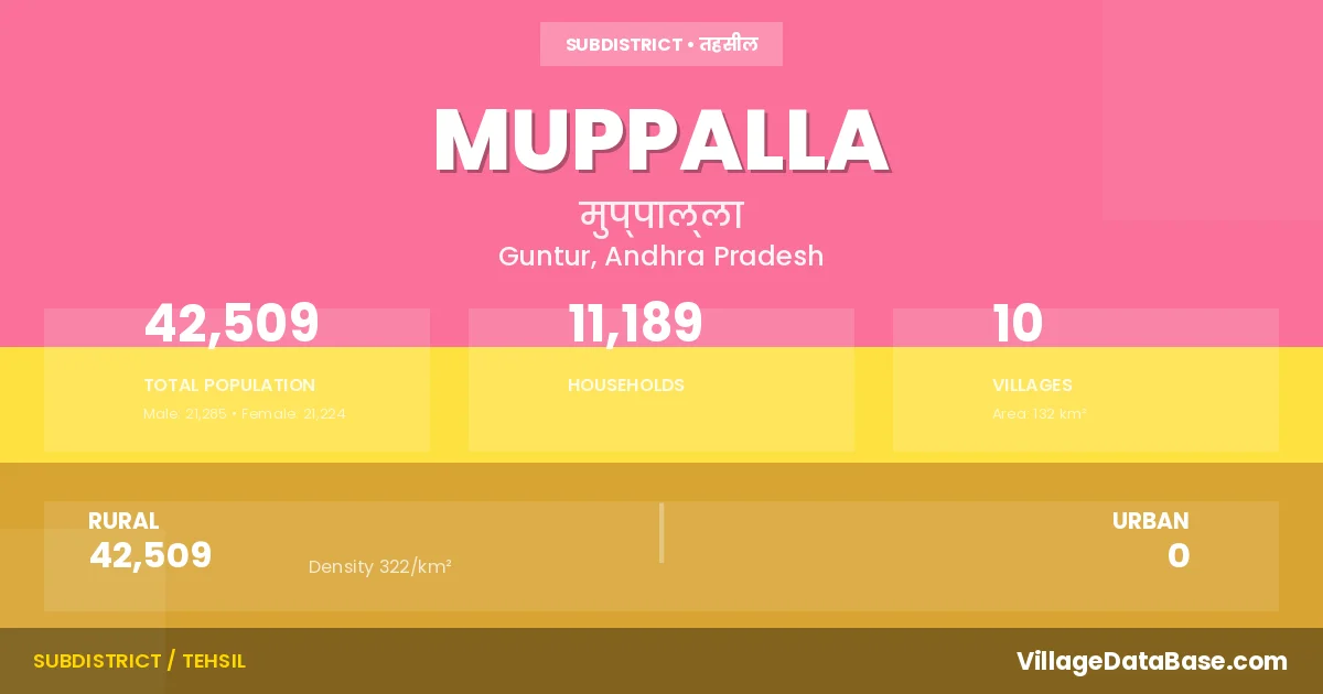 According to the 2011 census The total area of Muppalla Mandal is 132 km², with a population of 42509 people. The population density is 322 inhabitants per square kilometre, and there are approximately 11189 houses in the sub district.