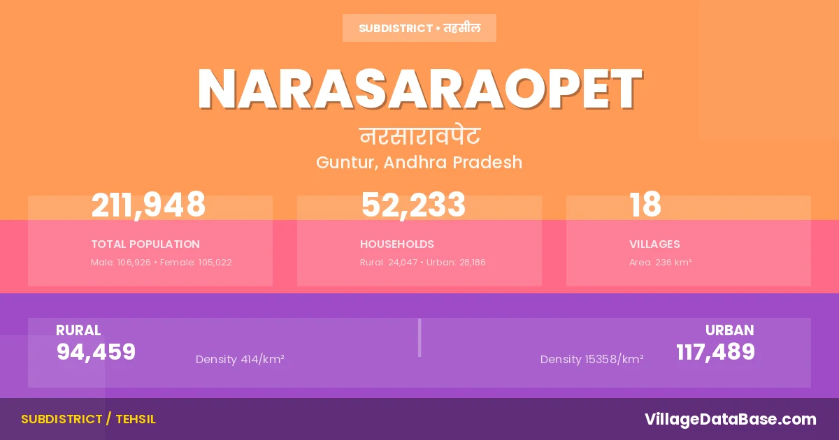 According to the 2011 census The total area of Narasaraopet Mandal is 236 km², with a population of 211948 people. The population density is 899 inhabitants per square kilometre, and there are approximately 52233 houses in the sub district.