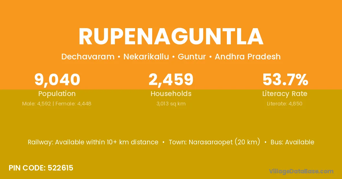 Narasaraopet (20 km) is the nearest town to Rupenaguntla village for major economic activities and is located approximately 20 km away.