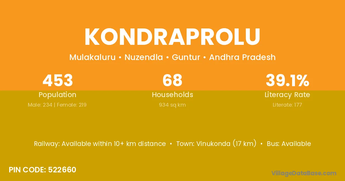 Vinukonda (17 km) is the nearest town to Kondraprolu village for major economic activities and is located approximately 17 km away.