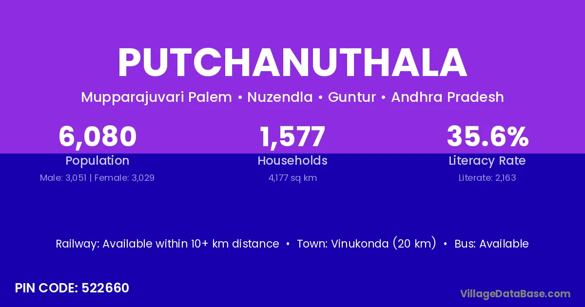 Vinukonda (20 km) is the nearest town to Putchanuthala village for major economic activities and is located approximately 20 km away.