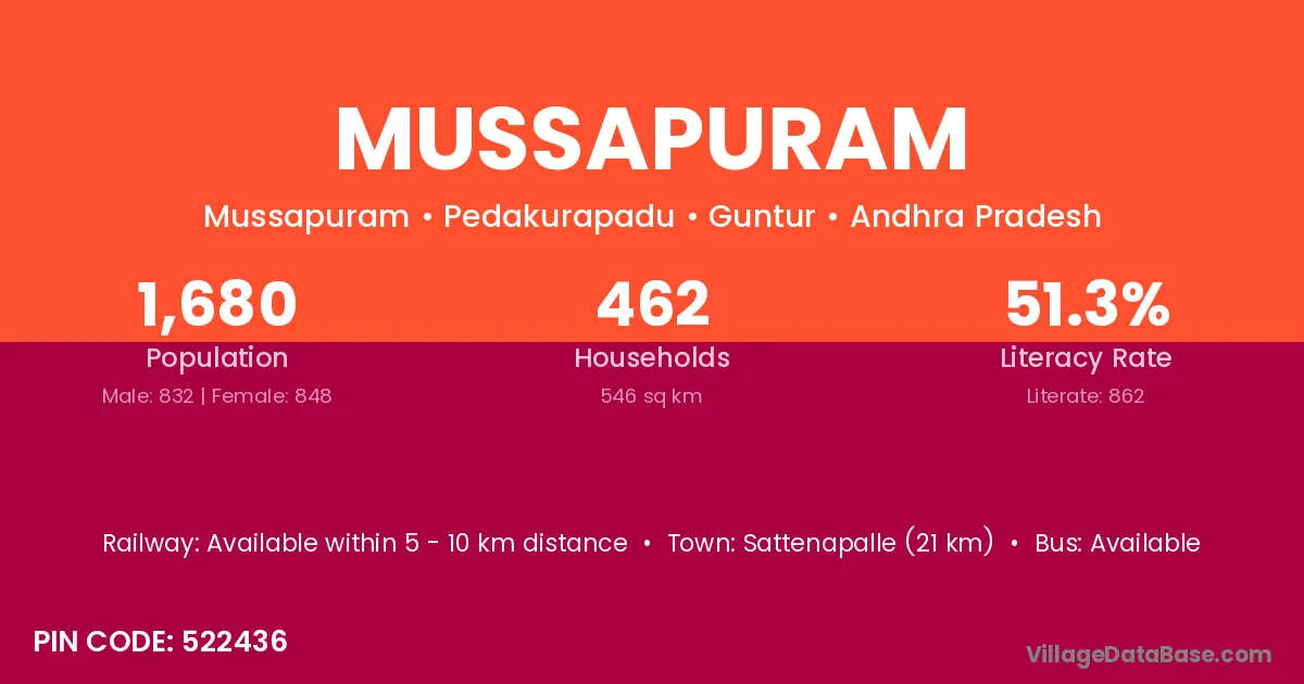 Sattenapalle (21 km) is the nearest town to Mussapuram village for major economic activities and is located approximately 21 km away.