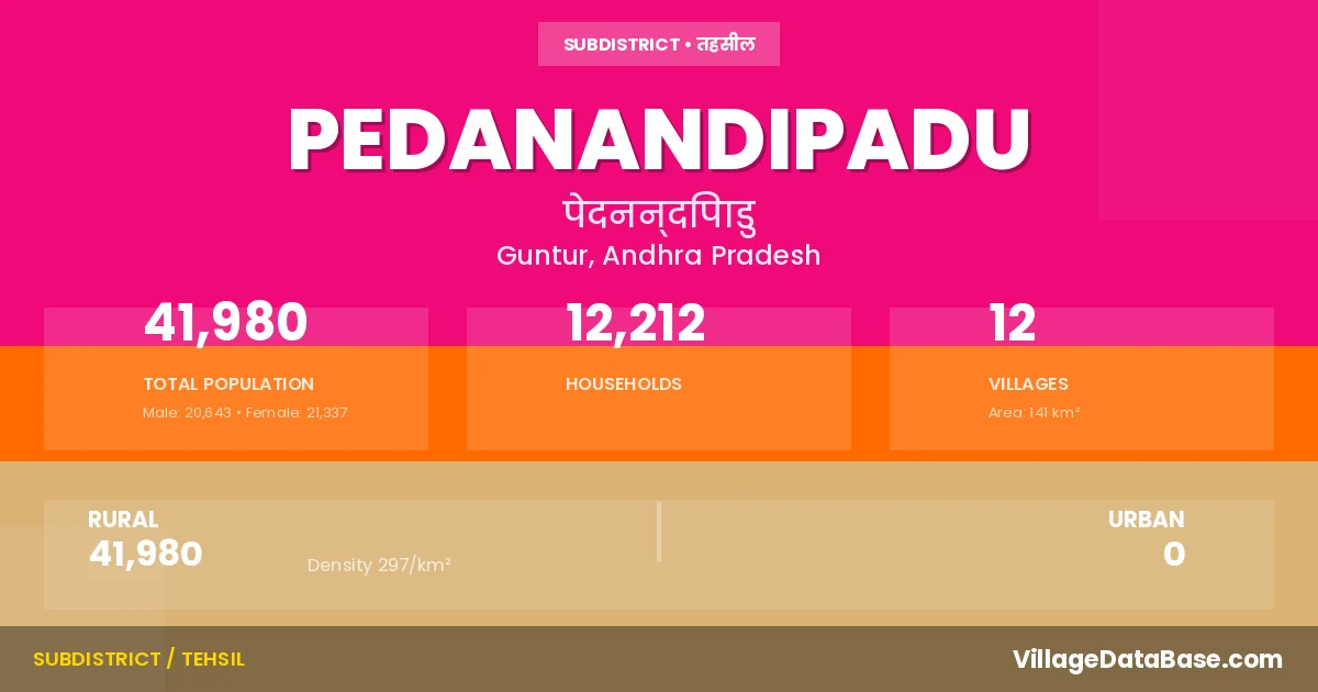 According to the 2011 census The total area of Pedanandipadu Mandal is 141 km², with a population of 41980 people. The population density is 297 inhabitants per square kilometre, and there are approximately 12212 houses in the sub district.