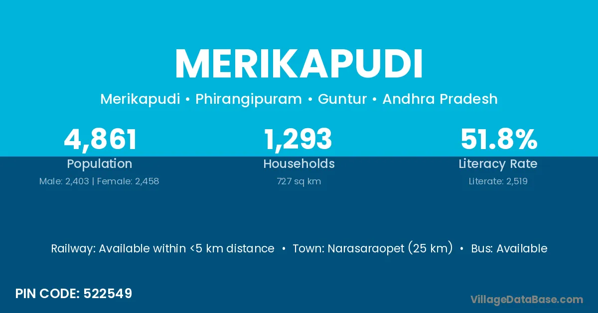 Narasaraopet (25 km) is the nearest town to Merikapudi village for major economic activities and is located approximately 25 km away.