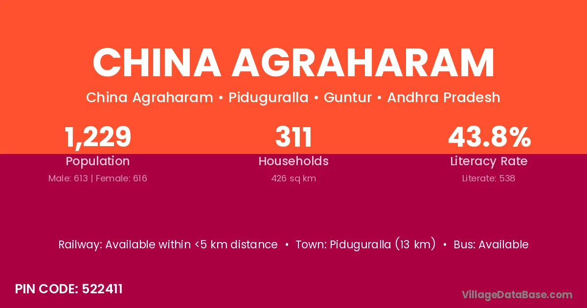 Piduguralla (13 km) is the nearest town to China Agraharam village for major economic activities and is located approximately 13 km away.
