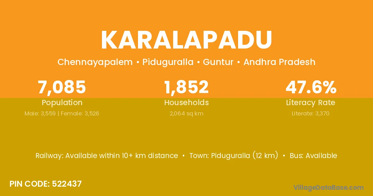 Karalapadu village has a total population of 7,085 people, of which 3,559 are males and 3,526 are females.