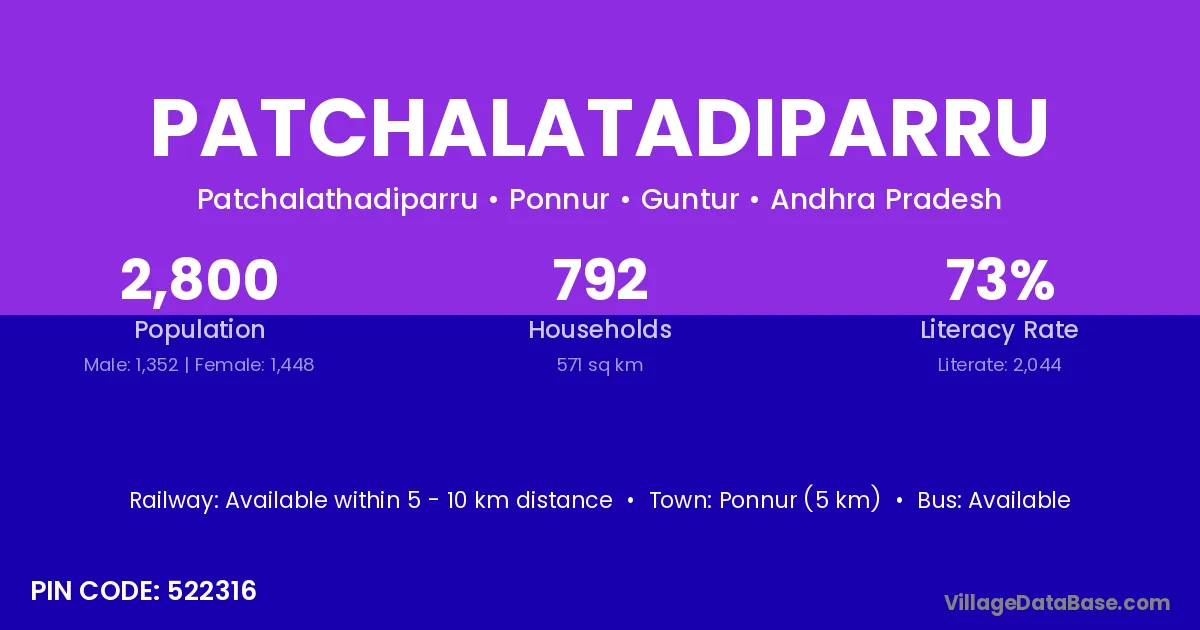 Ponnur (5 km) is the nearest town to Patchalatadiparru village for major economic activities and is located approximately 5 km away.