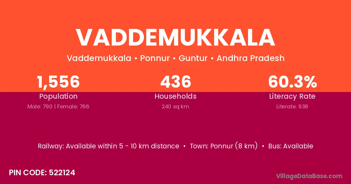 Ponnur (8 km) is the nearest town to Vaddemukkala village for major economic activities and is located approximately 8 km away.