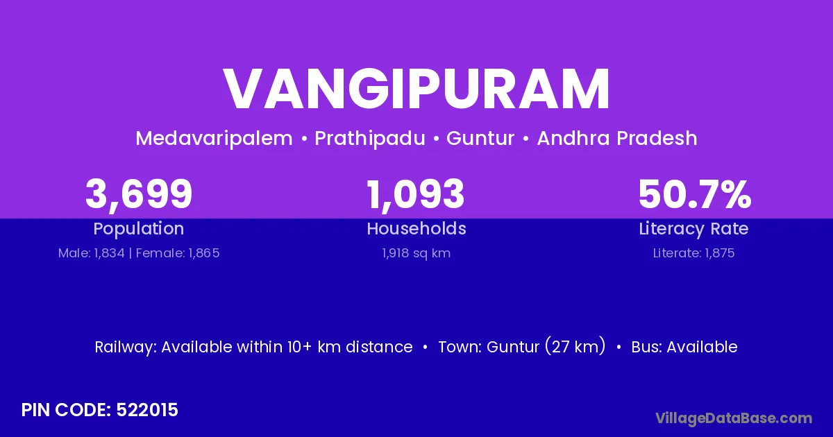 Vangipuram village has a total population of 3,699 people, of which 1,834 are males and 1,865 are females.