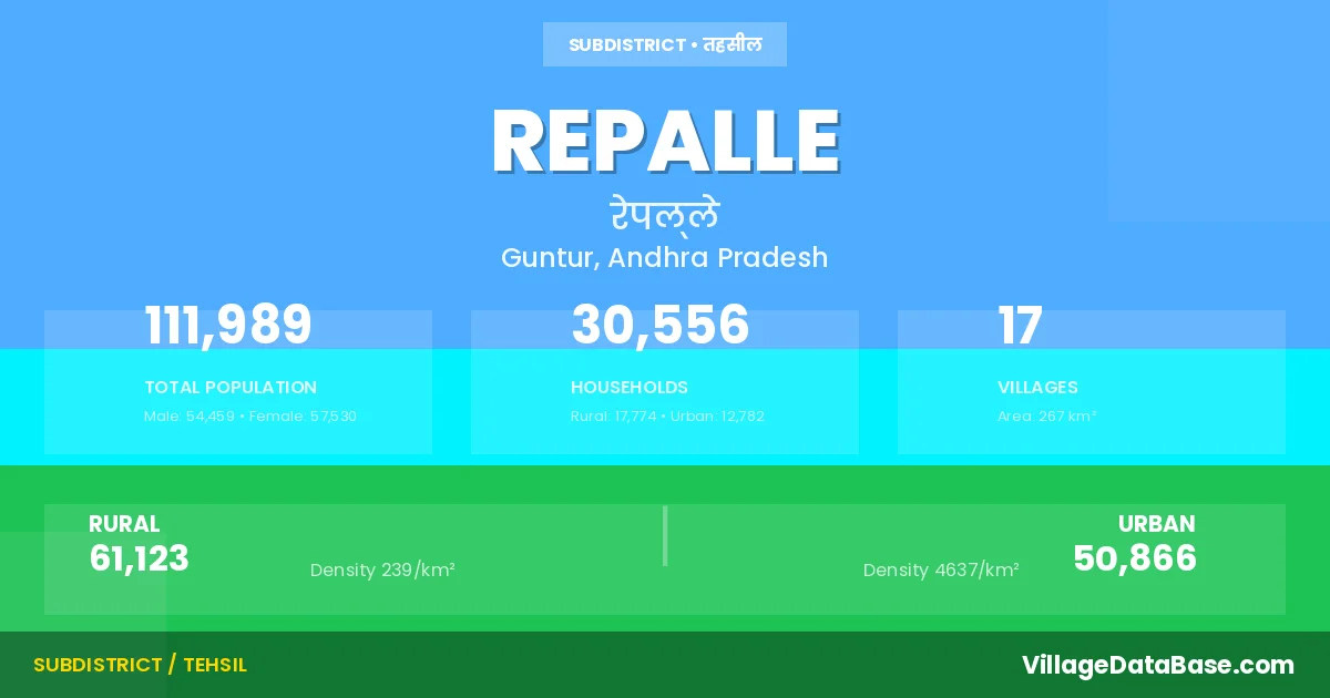 According to the 2011 census The total area of Repalle Mandal is 267 km², with a population of 111989 people. The population density is 419 inhabitants per square kilometre, and there are approximately 30556 houses in the sub district.