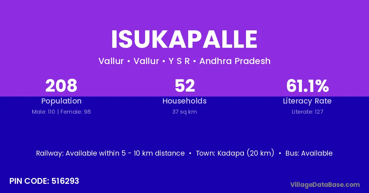 The literacy rate of Isukapalle village is 58.38%. Male literacy stands at 65.43% and female literacy at 51.27%.
