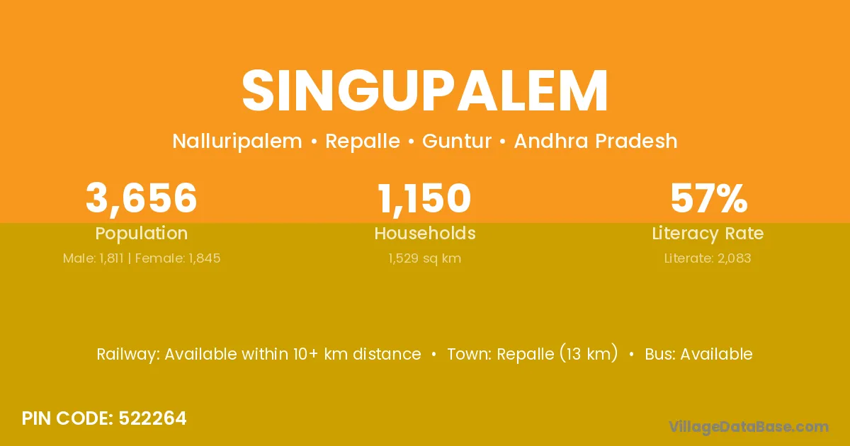 Repalle (13 km) is the nearest town to Singupalem village for major economic activities and is located approximately 13 km away.