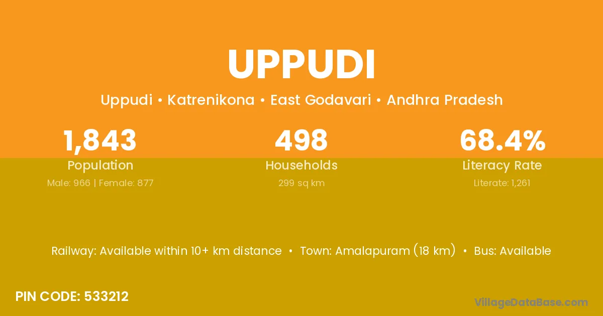 The literacy rate of Uppudi village is 64.86%. Male literacy stands at 69.79% and female literacy at 59.89%.