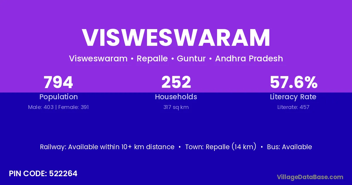 Visweswaram village has a total population of 794 people, of which 403 are males and 391 are females.