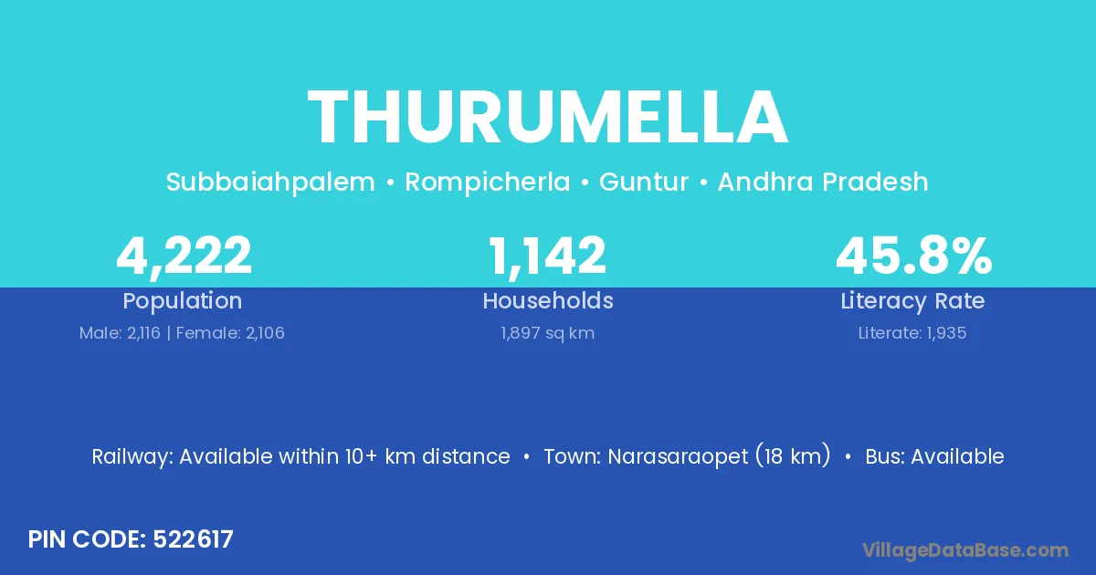 Narasaraopet (18 km) is the nearest town to Thurumella village for major economic activities and is located approximately 18 km away.
