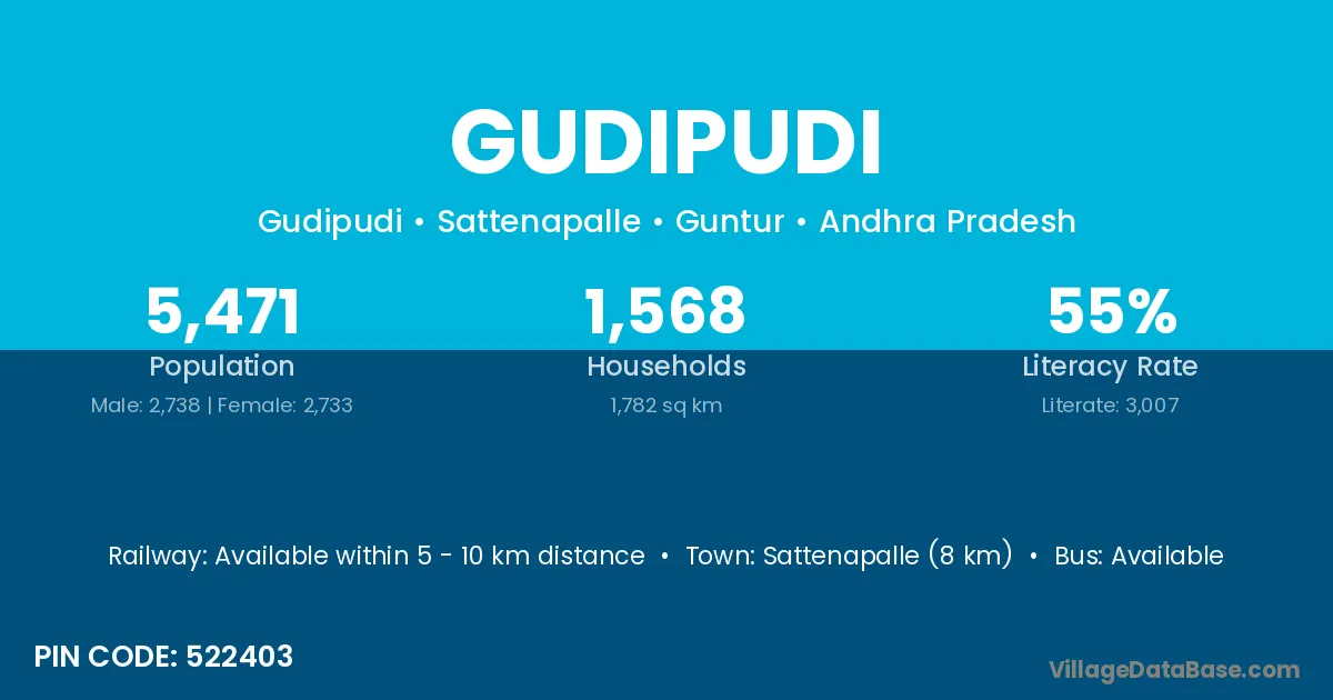 Sattenapalle (8 km) is the nearest town to Gudipudi village for major economic activities and is located approximately 8 km away.