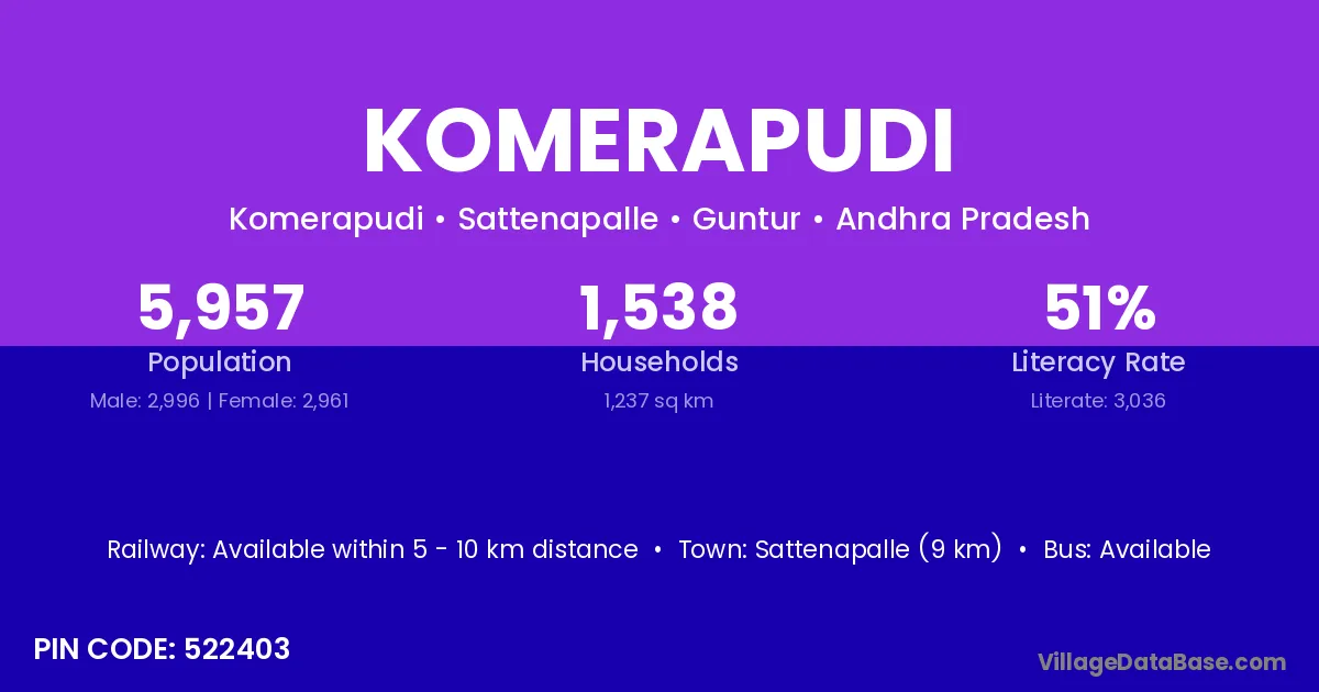 Sattenapalle (9 km) is the nearest town to Komerapudi village for major economic activities and is located approximately 9 km away.