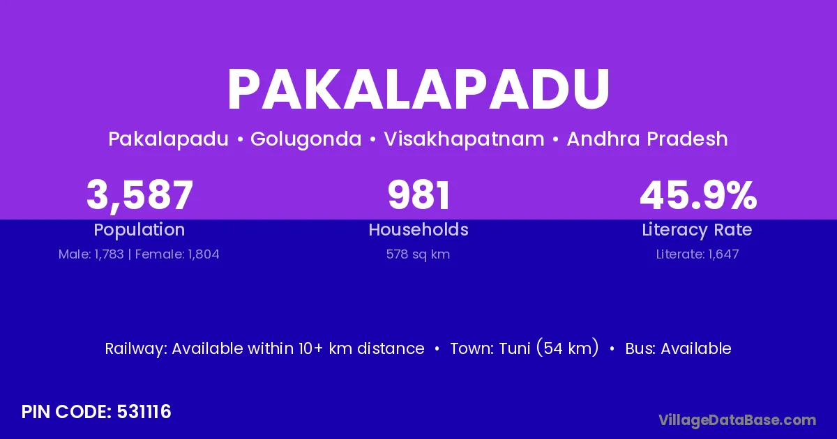 The literacy rate of Pakalapadu village is 49.11%. Male literacy stands at 56.09% and female literacy at 42.20%.