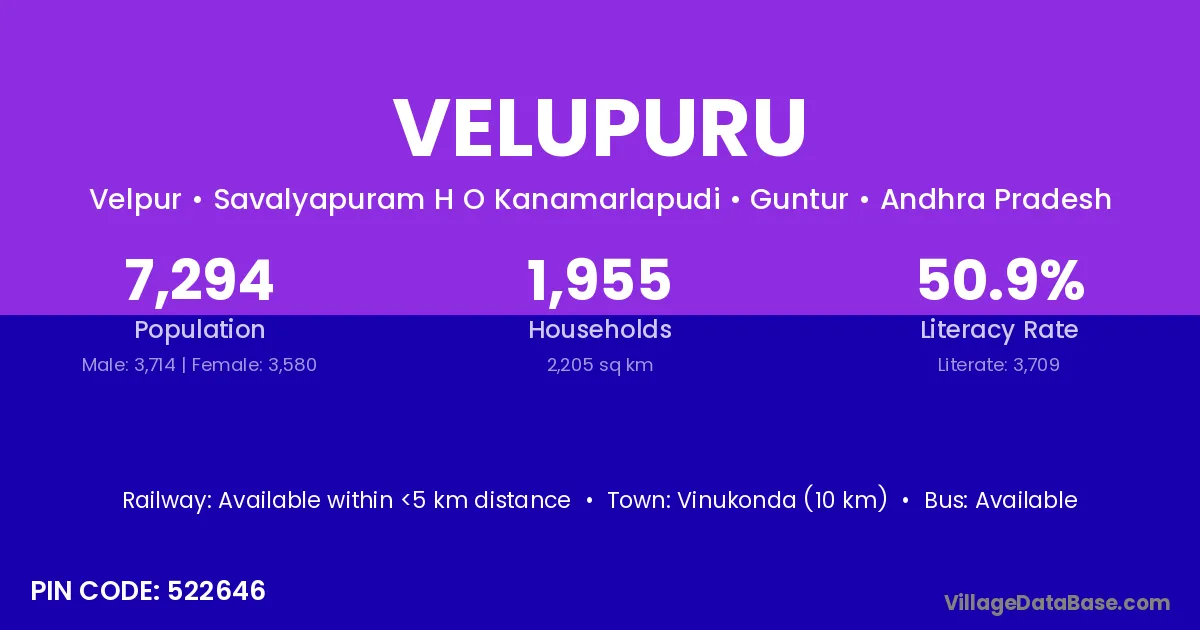 Vinukonda (10 km) is the nearest town to Velupuru village for major economic activities and is located approximately 10 km away.