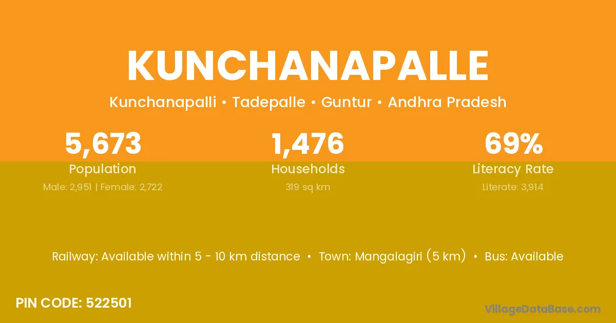 Mangalagiri (5 km) is the nearest town to Kunchanapalle village for major economic activities and is located approximately 5 km away.