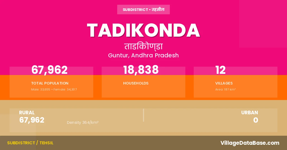 According to the 2011 census The total area of Tadikonda Mandal is 187 km², with a population of 67962 people. The population density is 364 inhabitants per square kilometre, and there are approximately 18838 houses in the sub district.