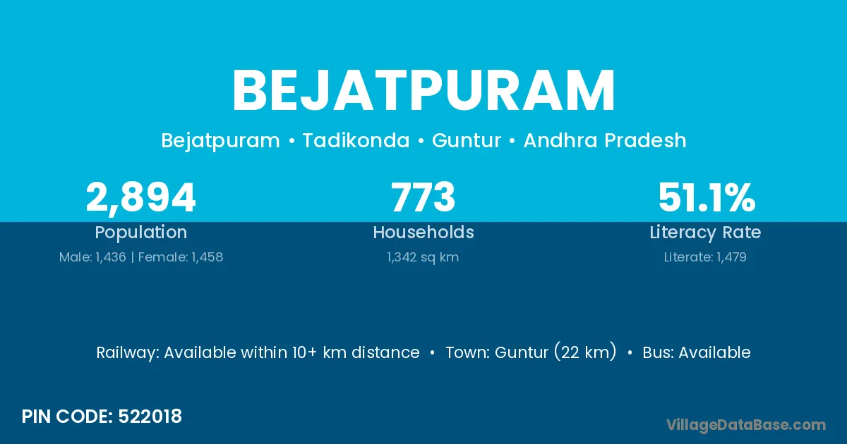 Guntur (22 km) is the nearest town to Bejatpuram village for major economic activities and is located approximately 22 km away.