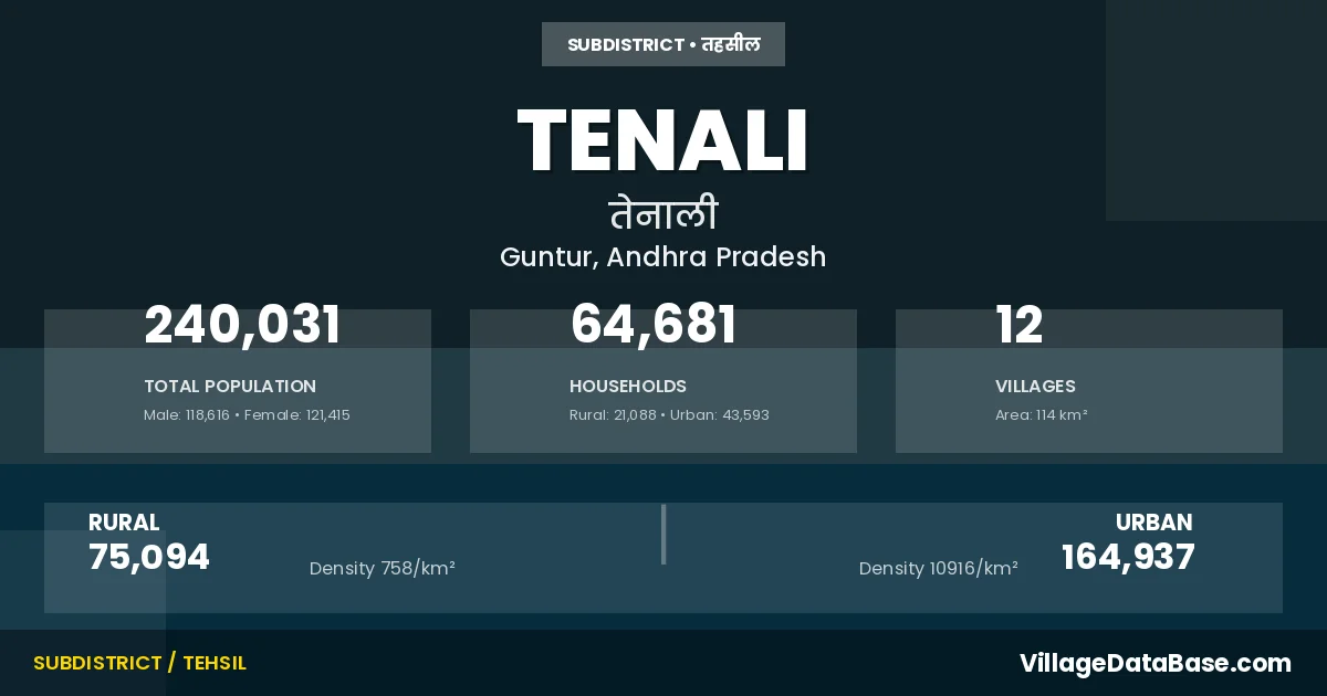 According to the 2011 census The total area of Tenali Mandal is 114 km², with a population of 240031 people. The population density is 2,101 inhabitants per square kilometre, and there are approximately 64681 houses in the sub district.