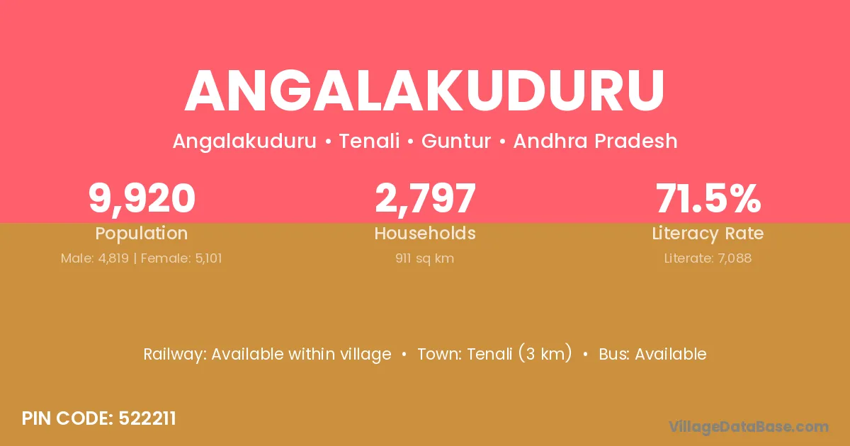 Tenali (3 km) is the nearest town to Angalakuduru village for major economic activities and is located approximately 3 km away.