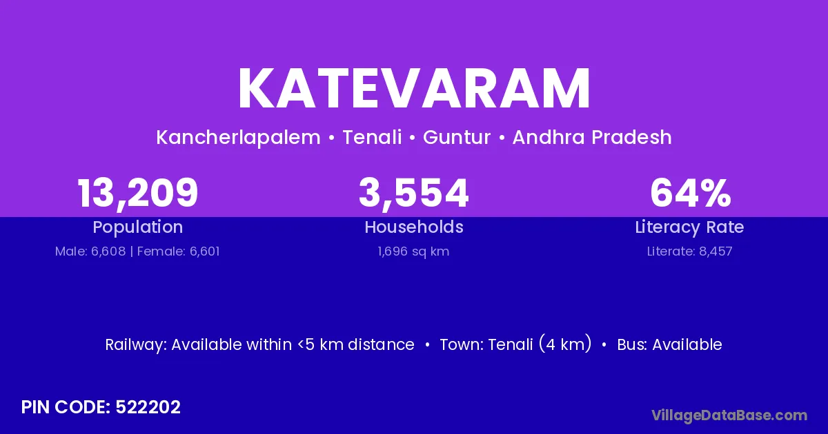 Tenali (4 km) is the nearest town to Katevaram village for major economic activities and is located approximately 4 km away.