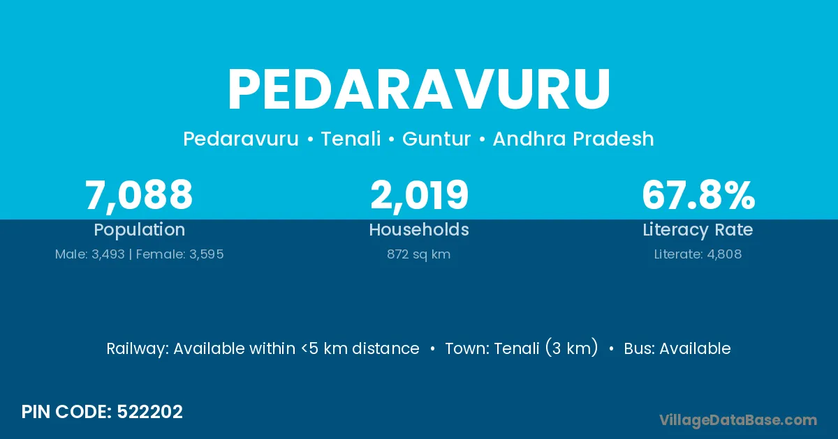 Tenali (3 km) is the nearest town to Pedaravuru village for major economic activities and is located approximately 3 km away.