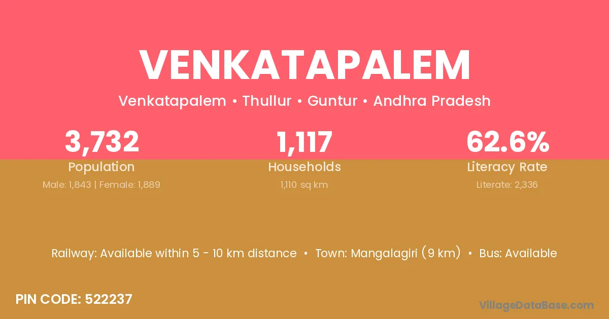 Venkatapalem village has a total population of 3,732 people, of which 1,843 are males and 1,889 are females.