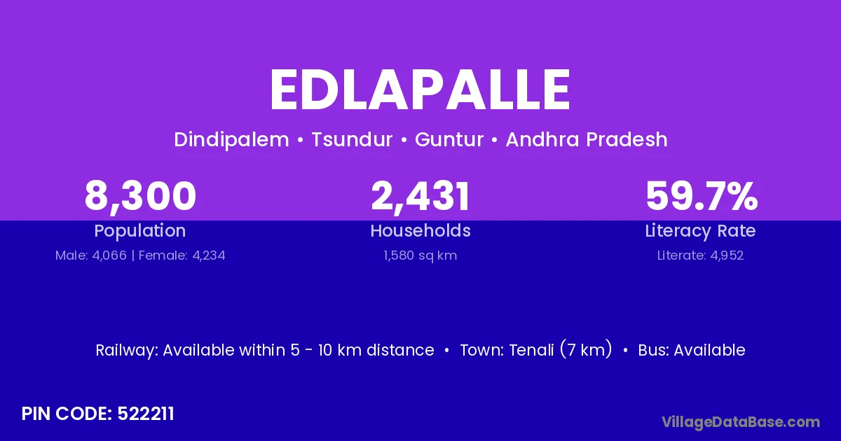 Tenali (7 km) is the nearest town to Edlapalle village for major economic activities and is located approximately 7 km away.