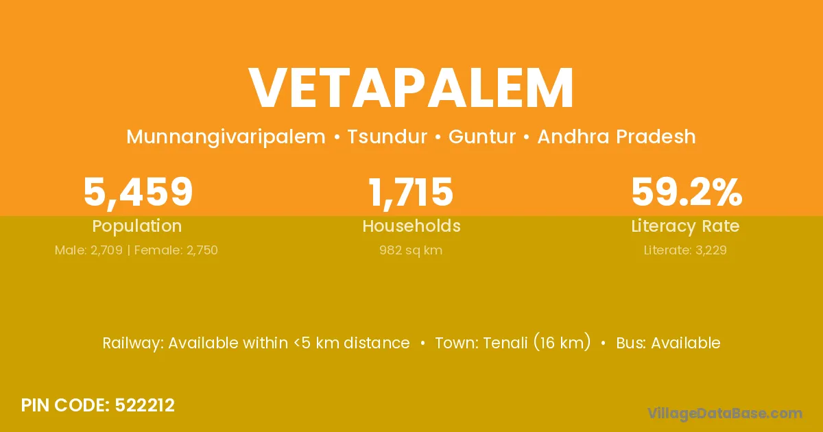 Tenali (16 km) is the nearest town to Vetapalem village for major economic activities and is located approximately 16 km away.