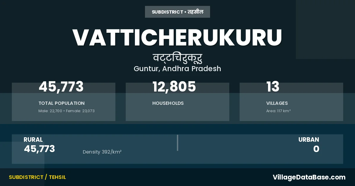 According to the 2011 census The total area of Vatticherukuru Mandal is 117 km², with a population of 45773 people. The population density is 392 inhabitants per square kilometre, and there are approximately 12805 houses in the sub district.