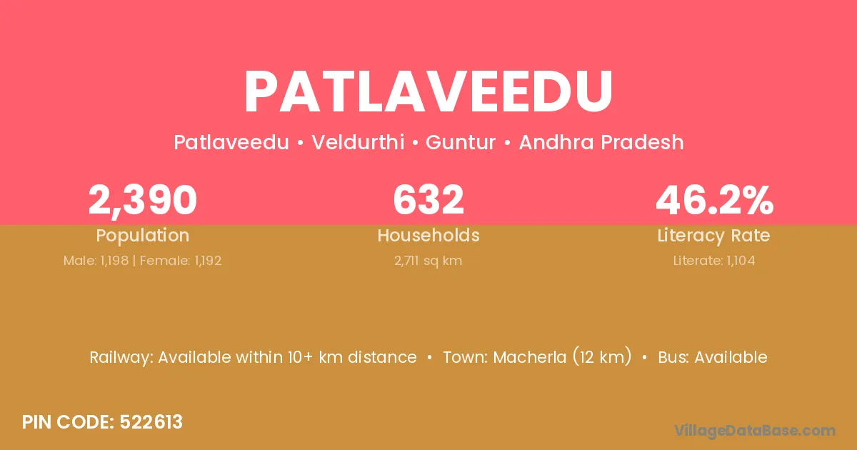 Macherla (12 km) is the nearest town to Patlaveedu village for major economic activities and is located approximately 12 km away.