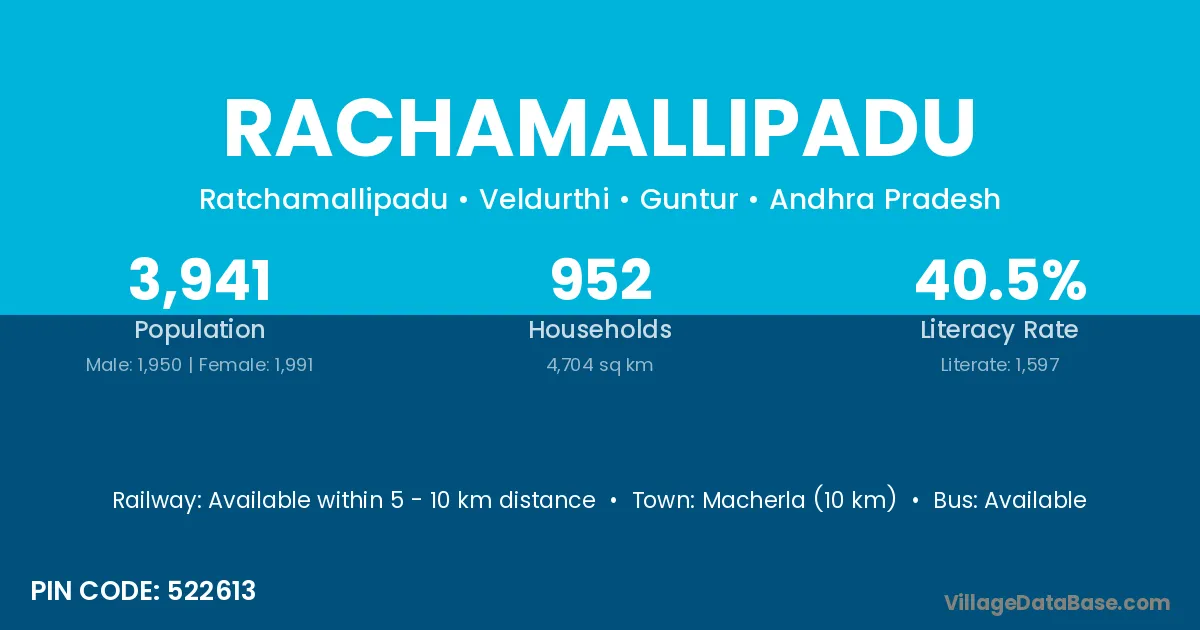 Macherla (10 km) is the nearest town to Rachamallipadu village for major economic activities and is located approximately 10 km away.