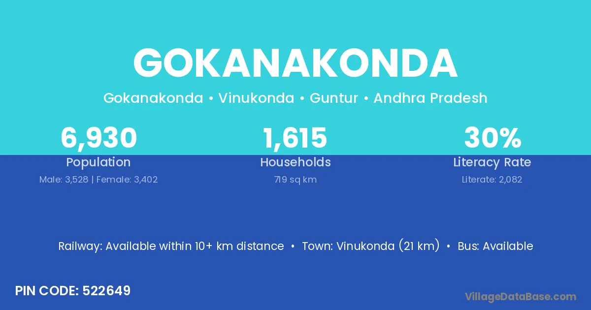 Vinukonda (21 km) is the nearest town to Gokanakonda village for major economic activities and is located approximately 21 km away.