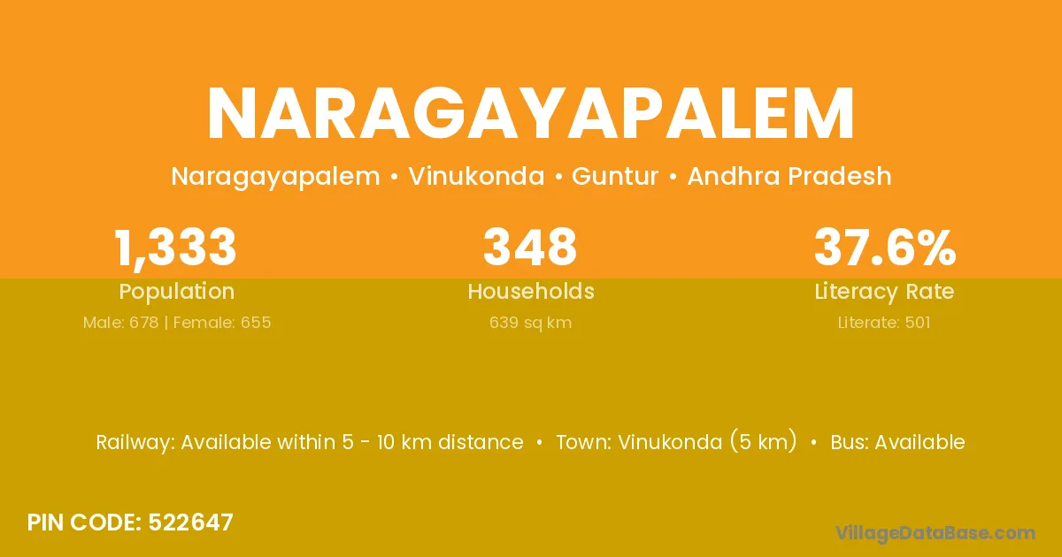 Vinukonda (5 km) is the nearest town to Naragayapalem village for major economic activities and is located approximately 5 km away.