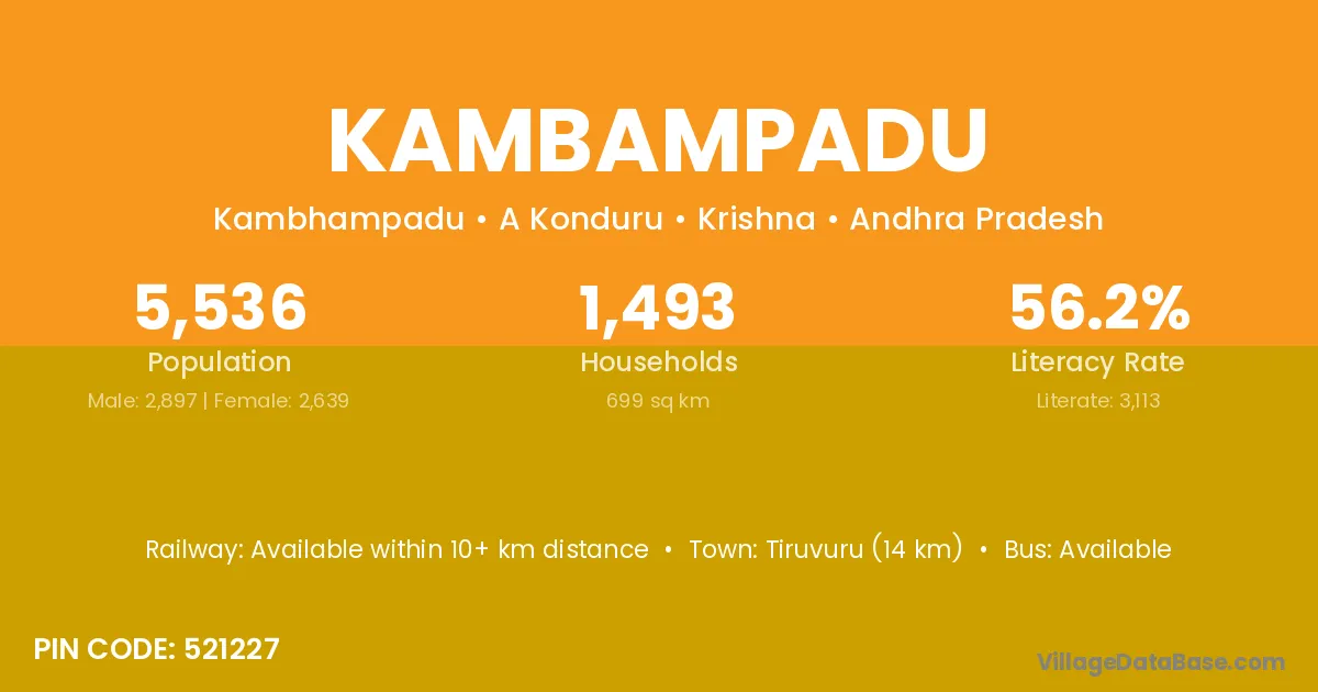 Kambampadu village has a total population of 5,536 people, of which 2,897 are males and 2,639 are females.